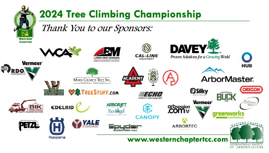 Event sponsorships are available on a first-come, first-served basis. All Sponsors will be recognized in the Western Arborist magazine, on the Chapter website at http://www.wcisa.net and will have a sign displayed prominently at the event site (Send artwork to repperson@wcisa.net)
